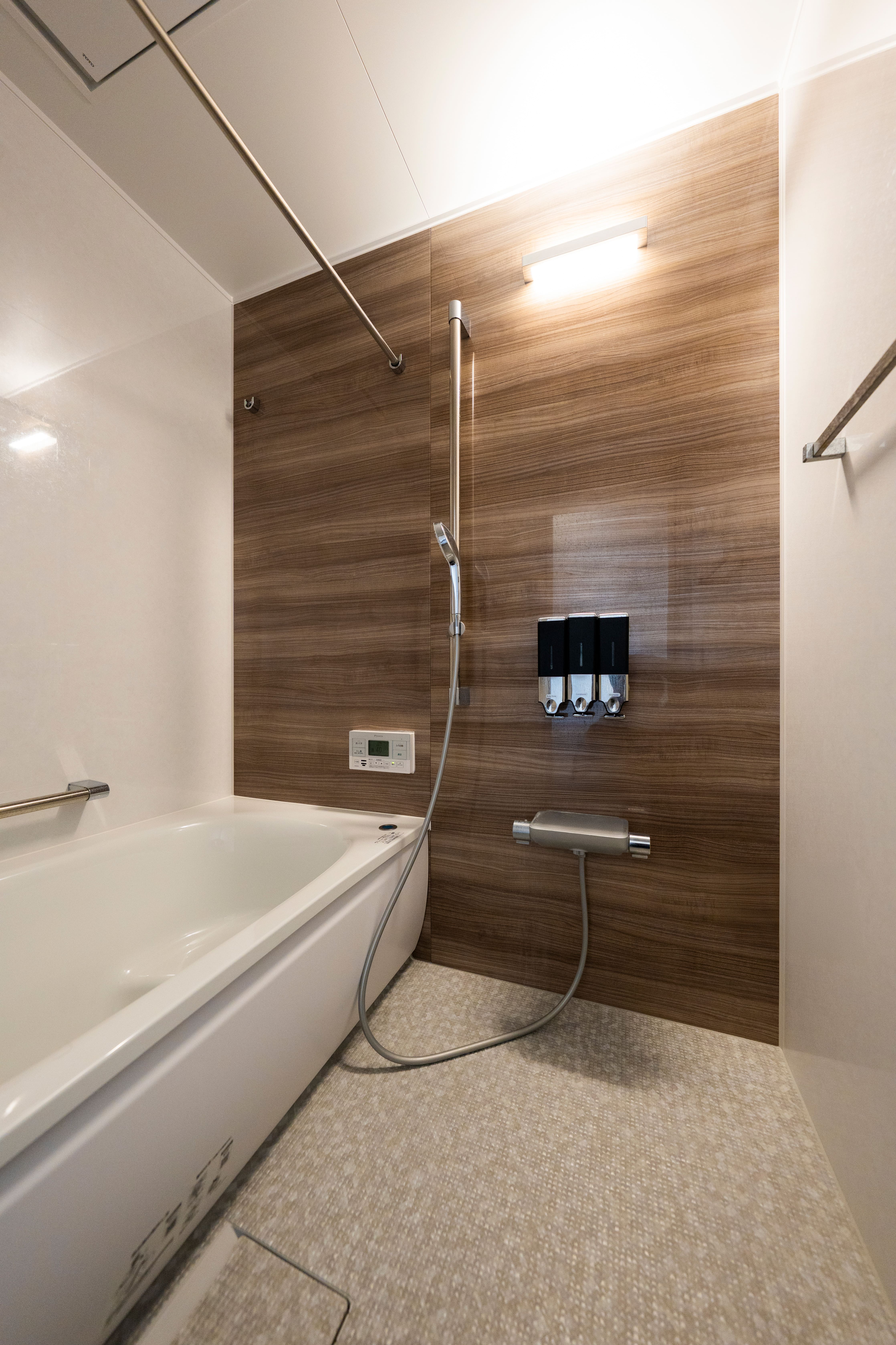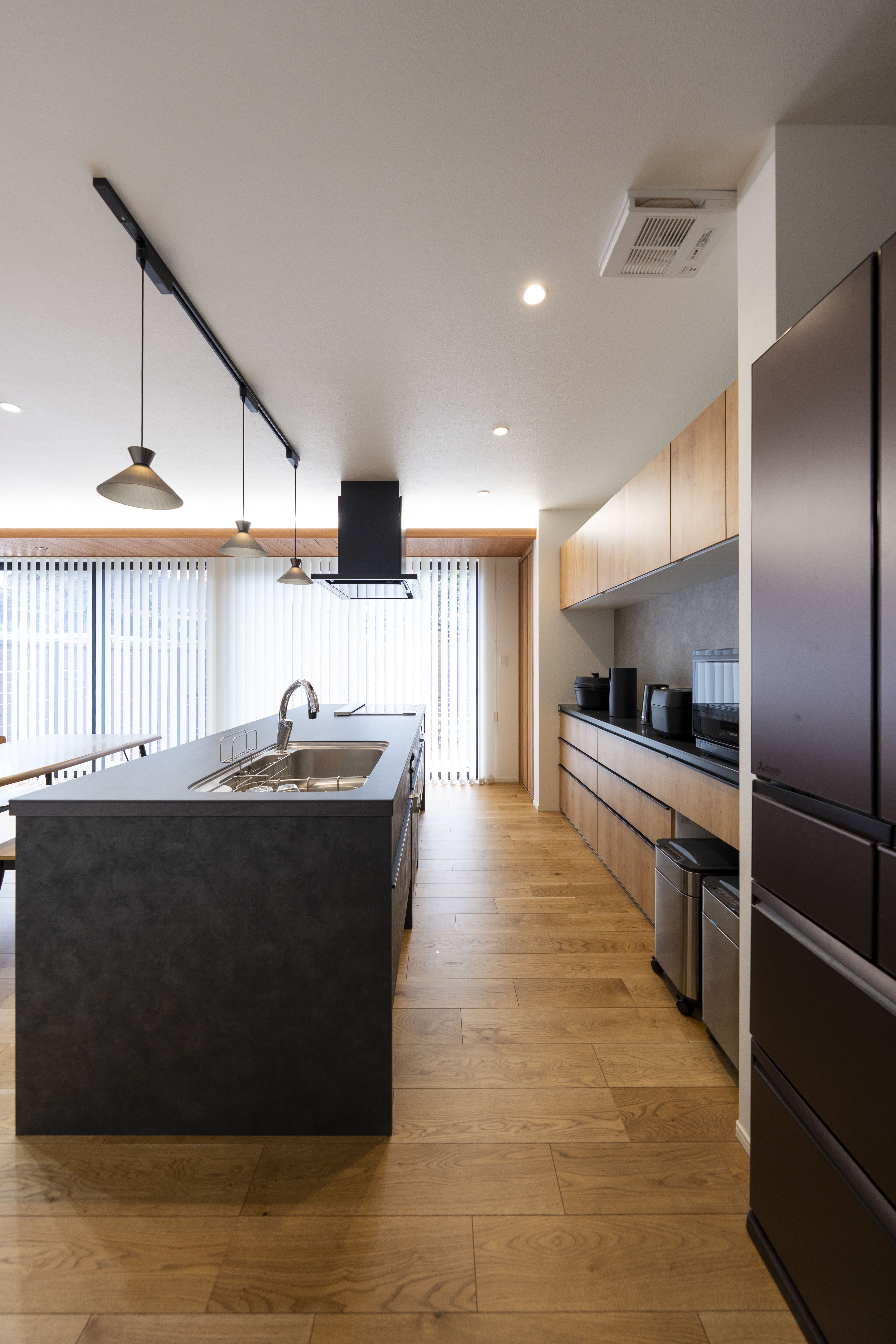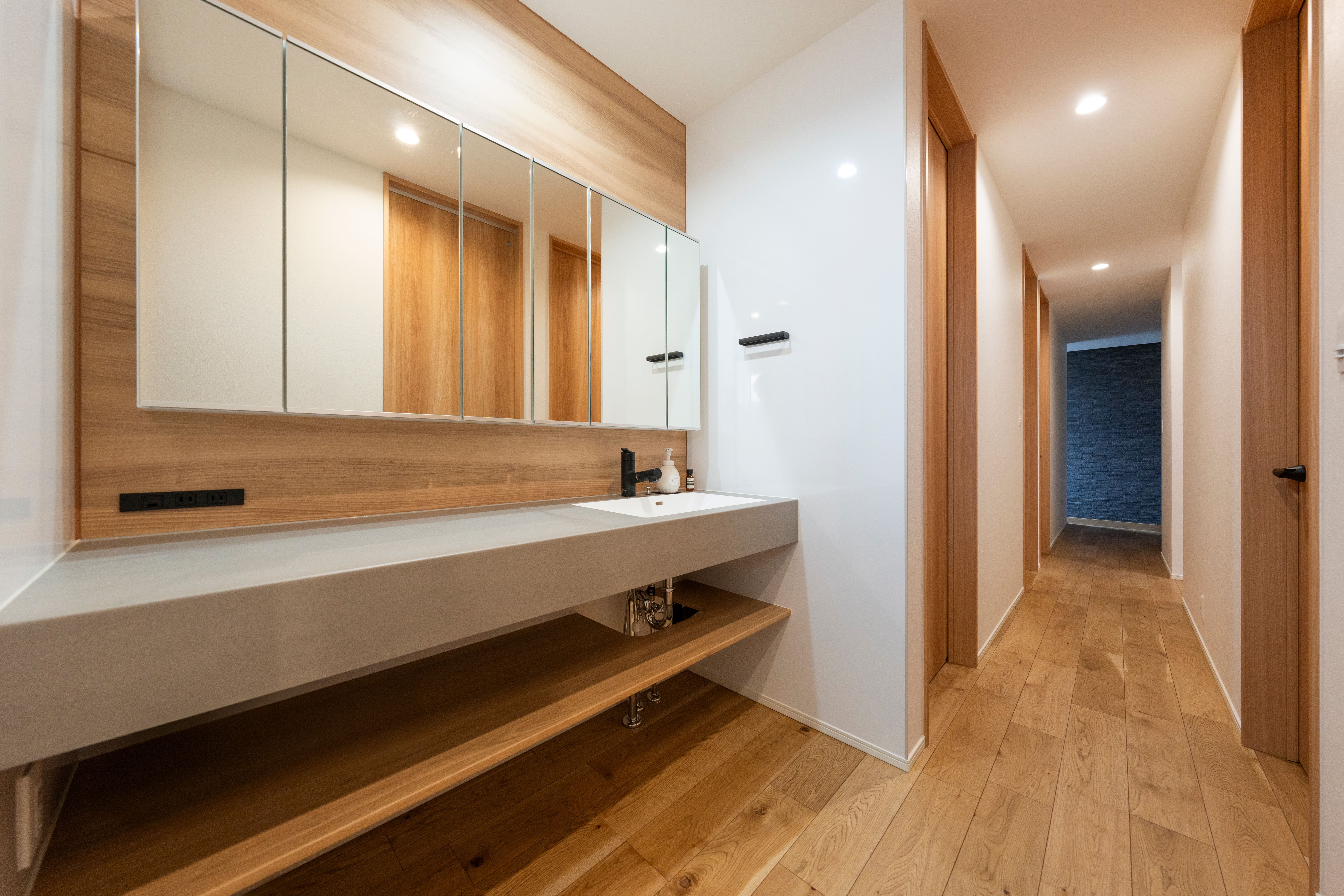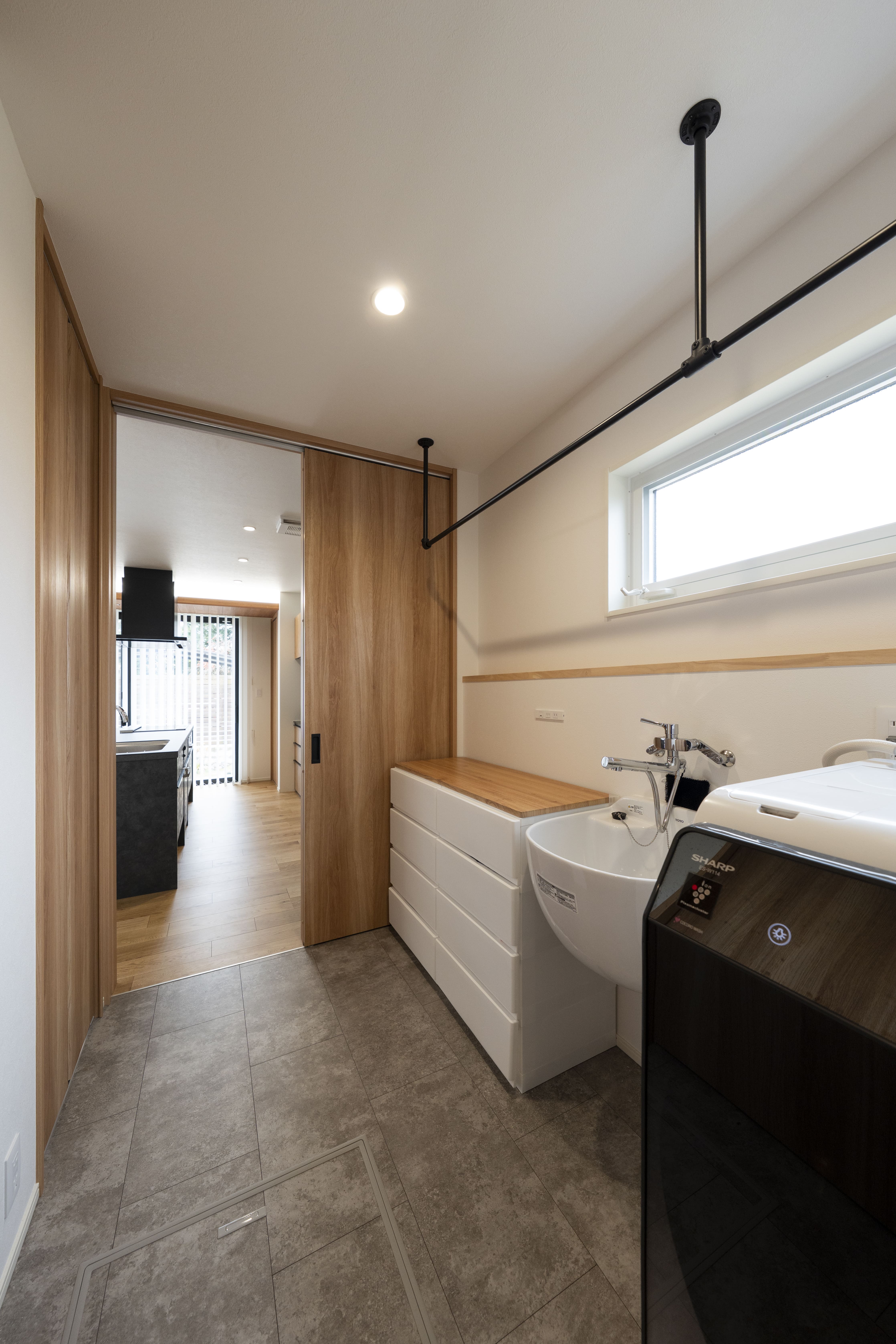 「生活動線を考えたのと、子どもを見守りやすいプランニングを考えました」とご主人がおっしゃる通り、水回りはキッチンからランドリールーム兼脱衣所、浴室が直線上に配置されている。