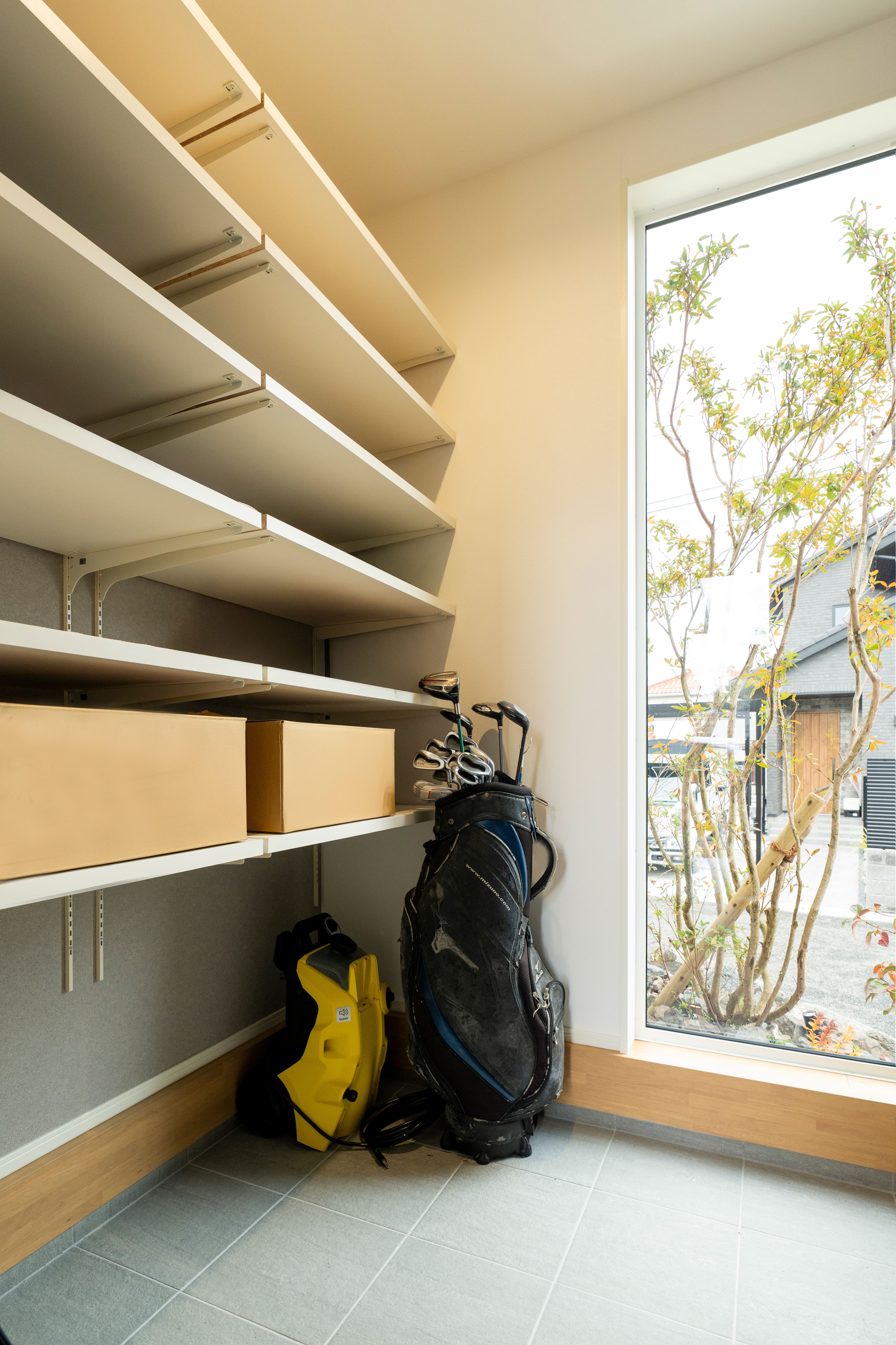 また、「なるべくモノを置かずにスッキリ見せたい」というご主人のこだわりもあり、収納の充実度も特徴だ。リビングは一見、テレビ側の壁部分で部屋が区切られているように見えるが、実はその奥に広い収納スペースがある。「ここに掃除道具を置いていて、サッと掃除ができるようになっているんです。あとは、本や育児用品もここに置いていますね」と奥様。